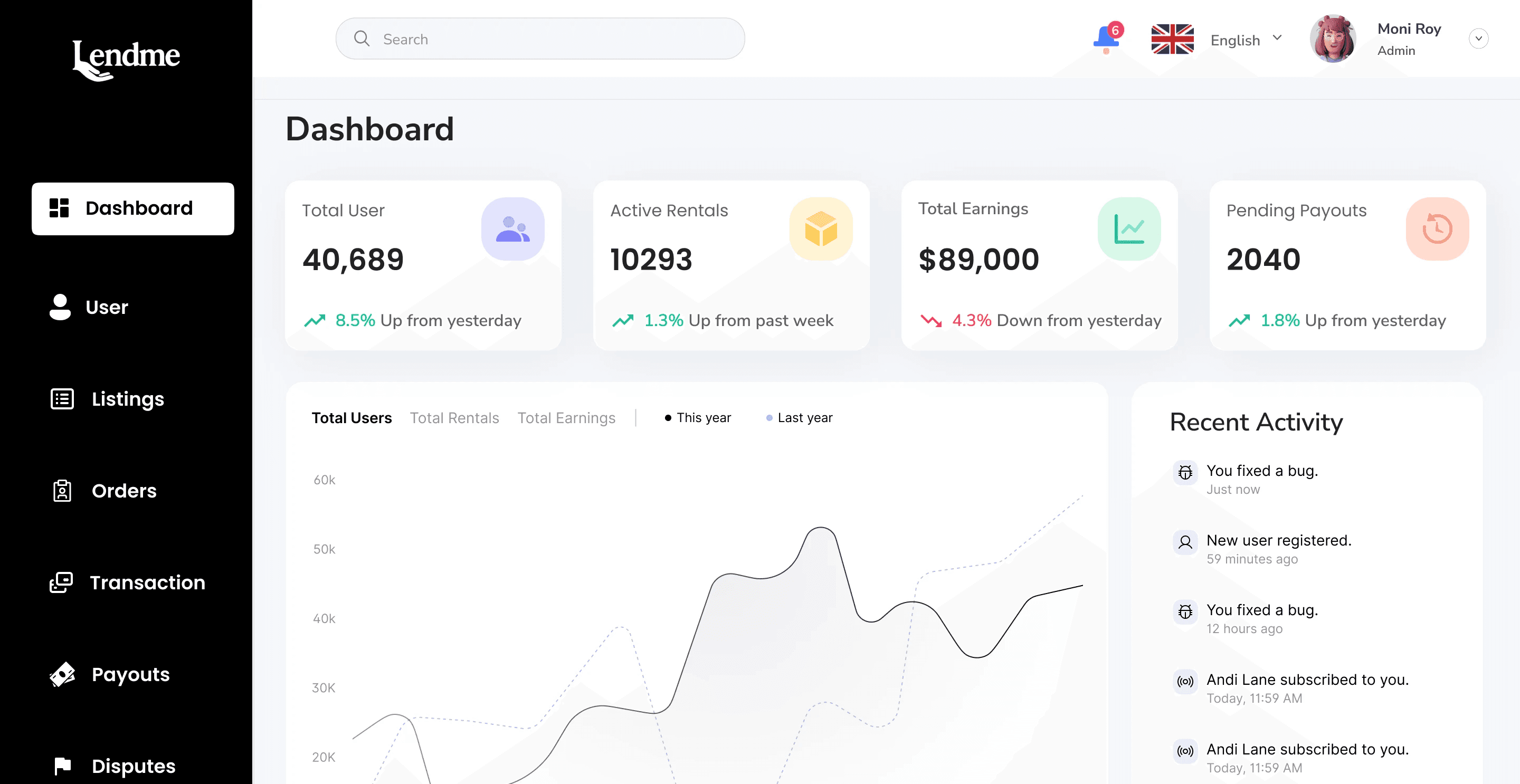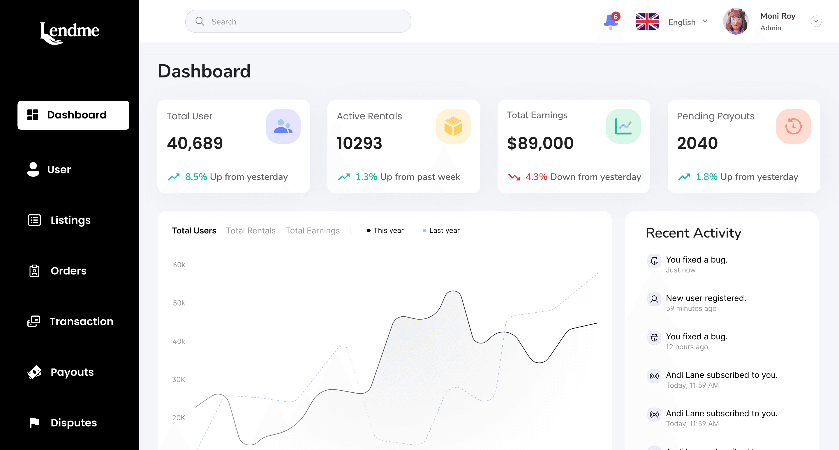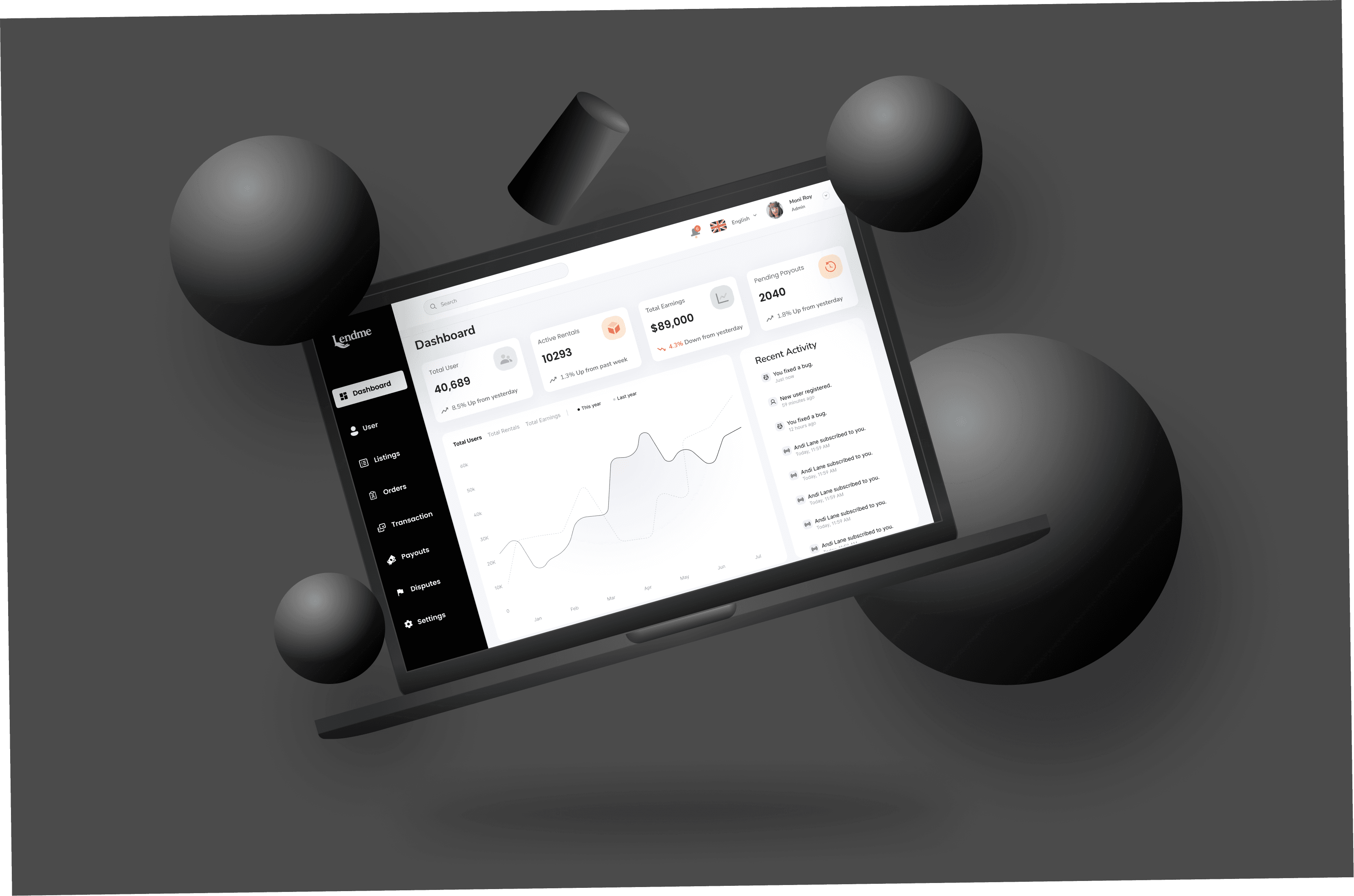 A responsive, full-screen desktop dashboard built to empower LendMe’s backend team with full control over the platform. Designed for clarity, speed, and complete visibility over user actvity, payouts, listings and disputes. This is the MVP dashboard created to scale with mobile app as it launches internationally.