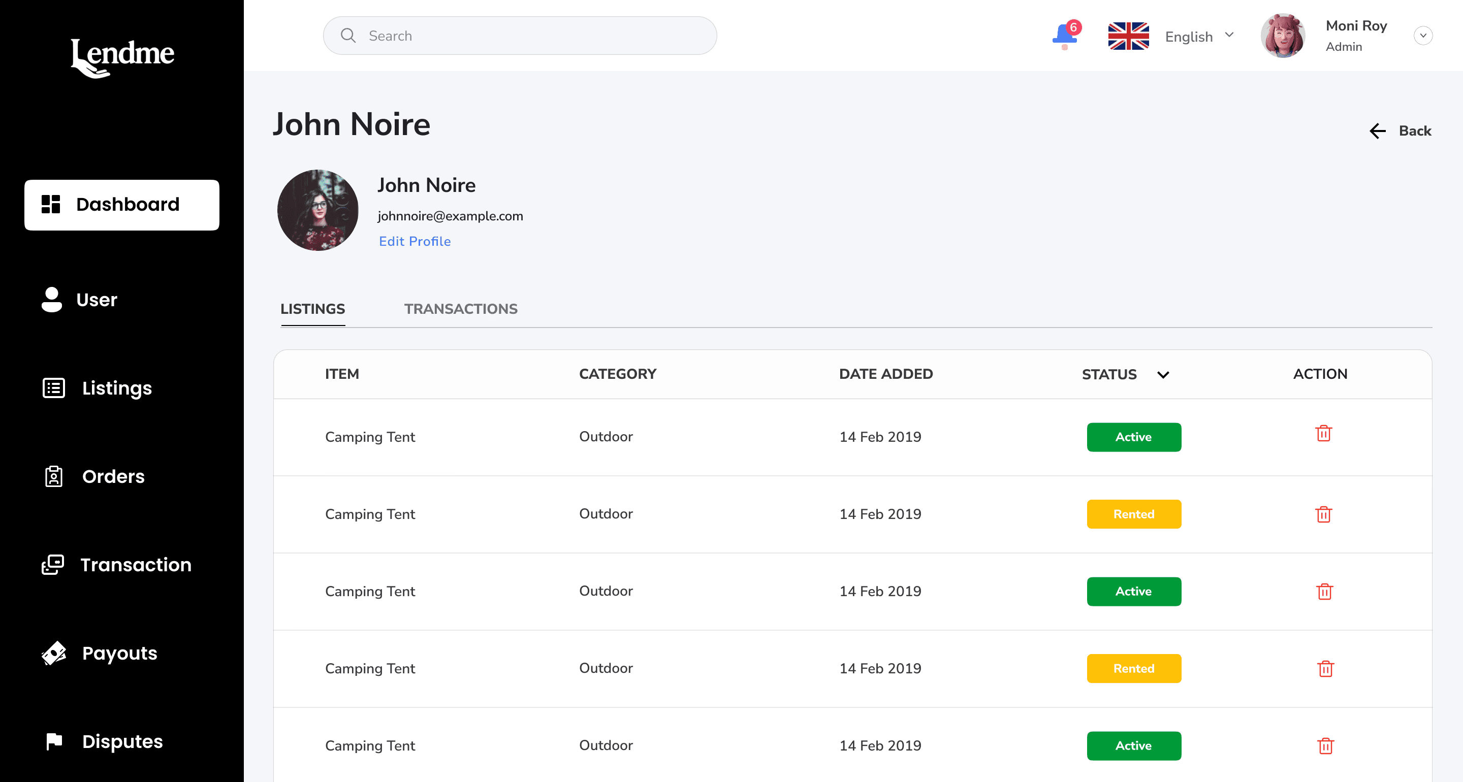 User Management: View, edit, deactivate users, see their listings and transaction history.