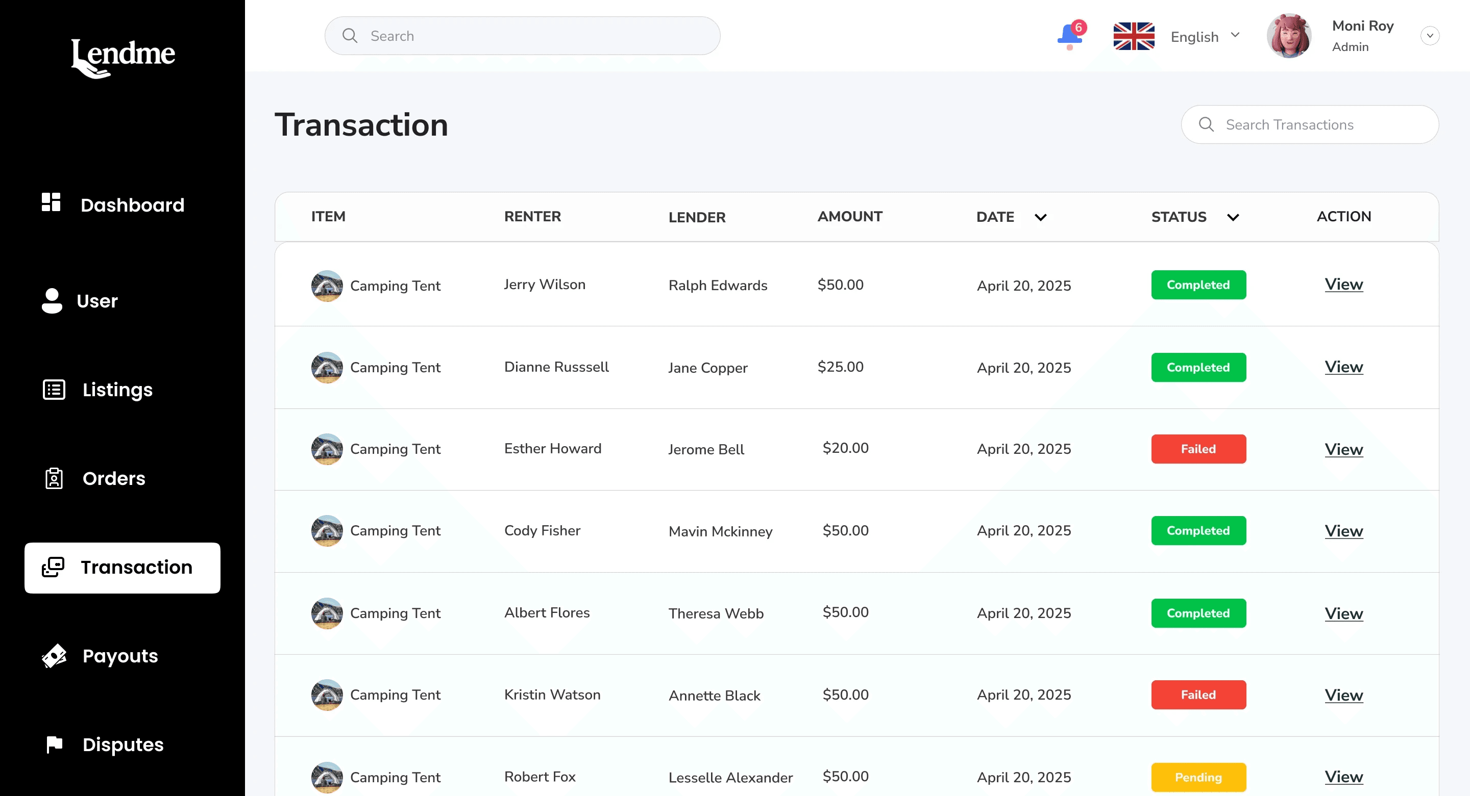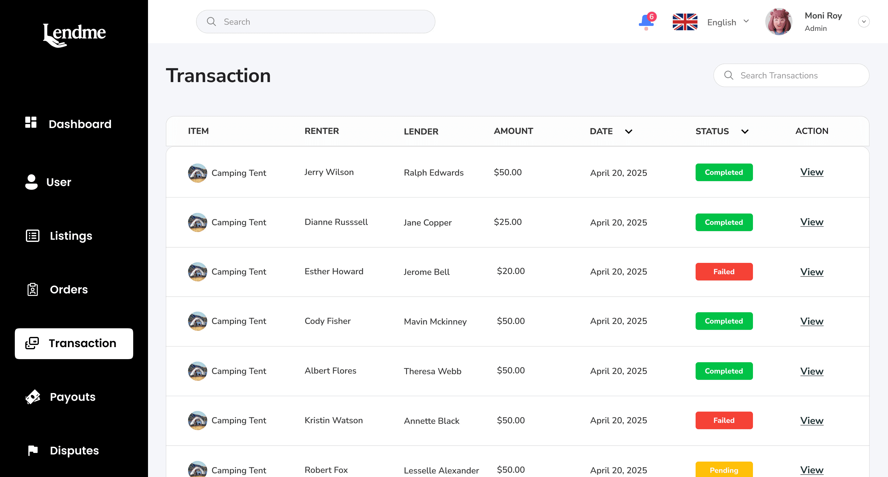 Transactions: View full rental records between lenders and renters.