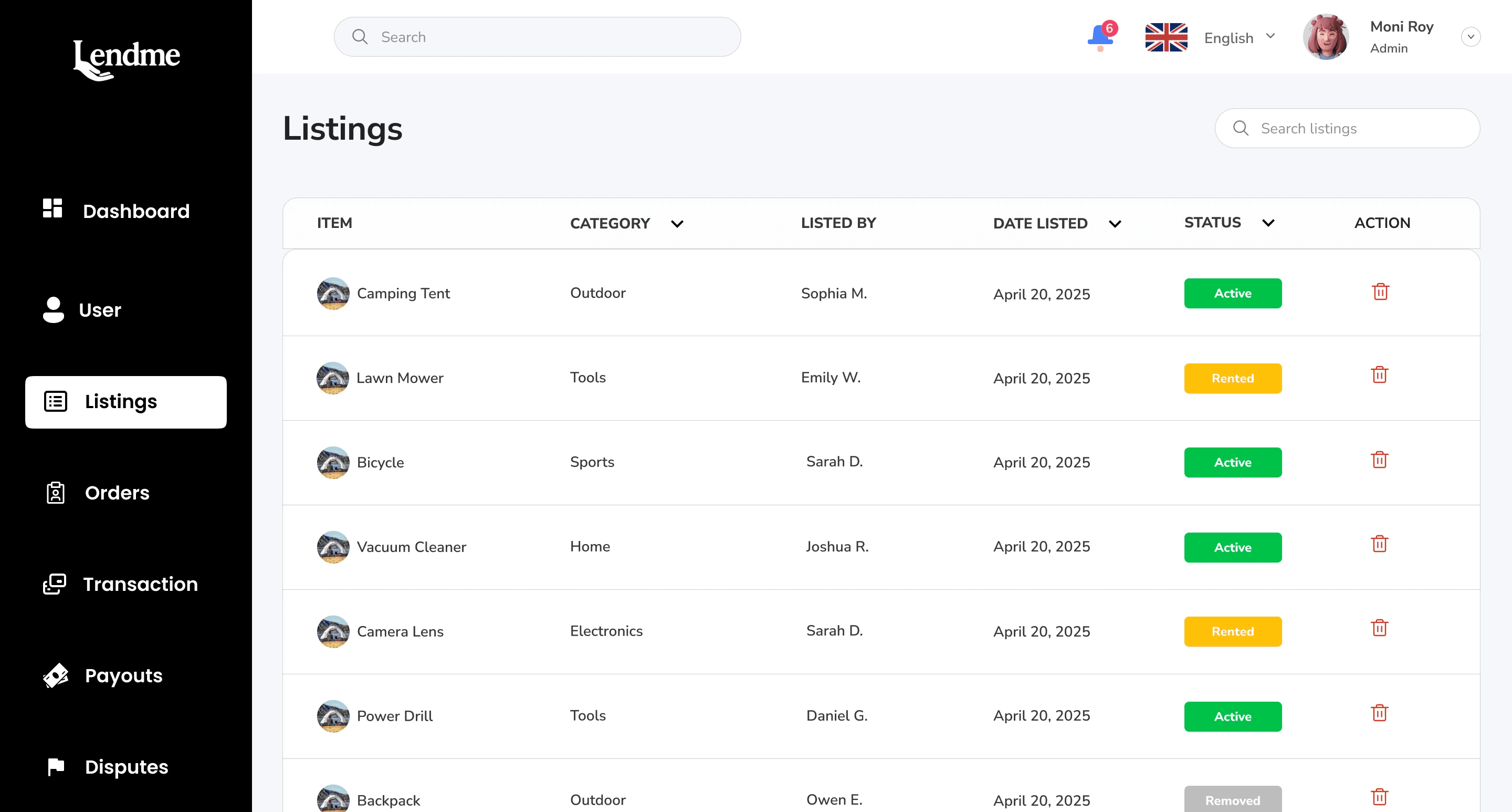Listings: Monitor all listed items, filter by status and edit or remove if necessary.
